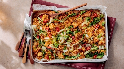 Noedels uit de oven? Ja hoor! Deze traybake met noedels, paksoi en tofu tover je zó de oven in en uit.